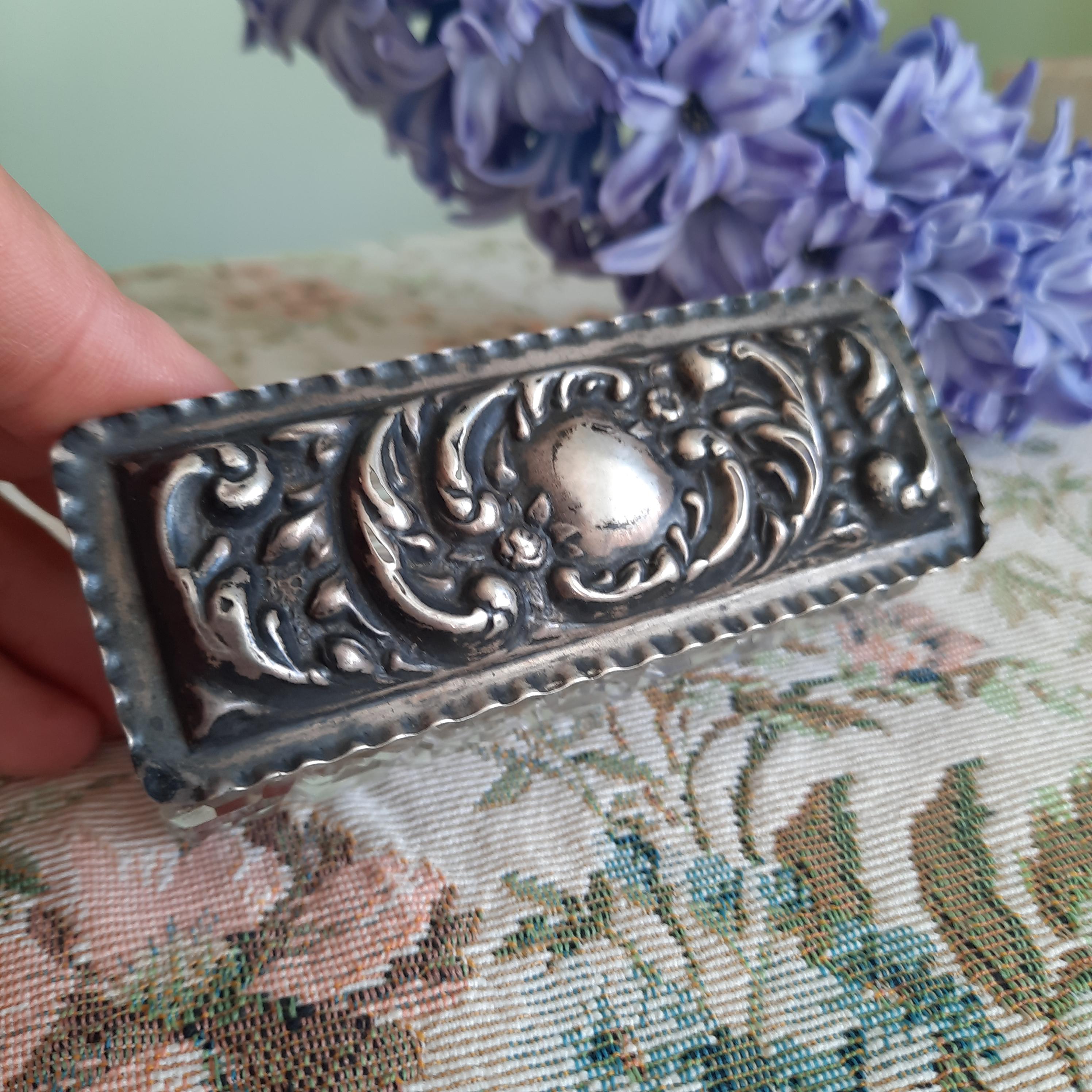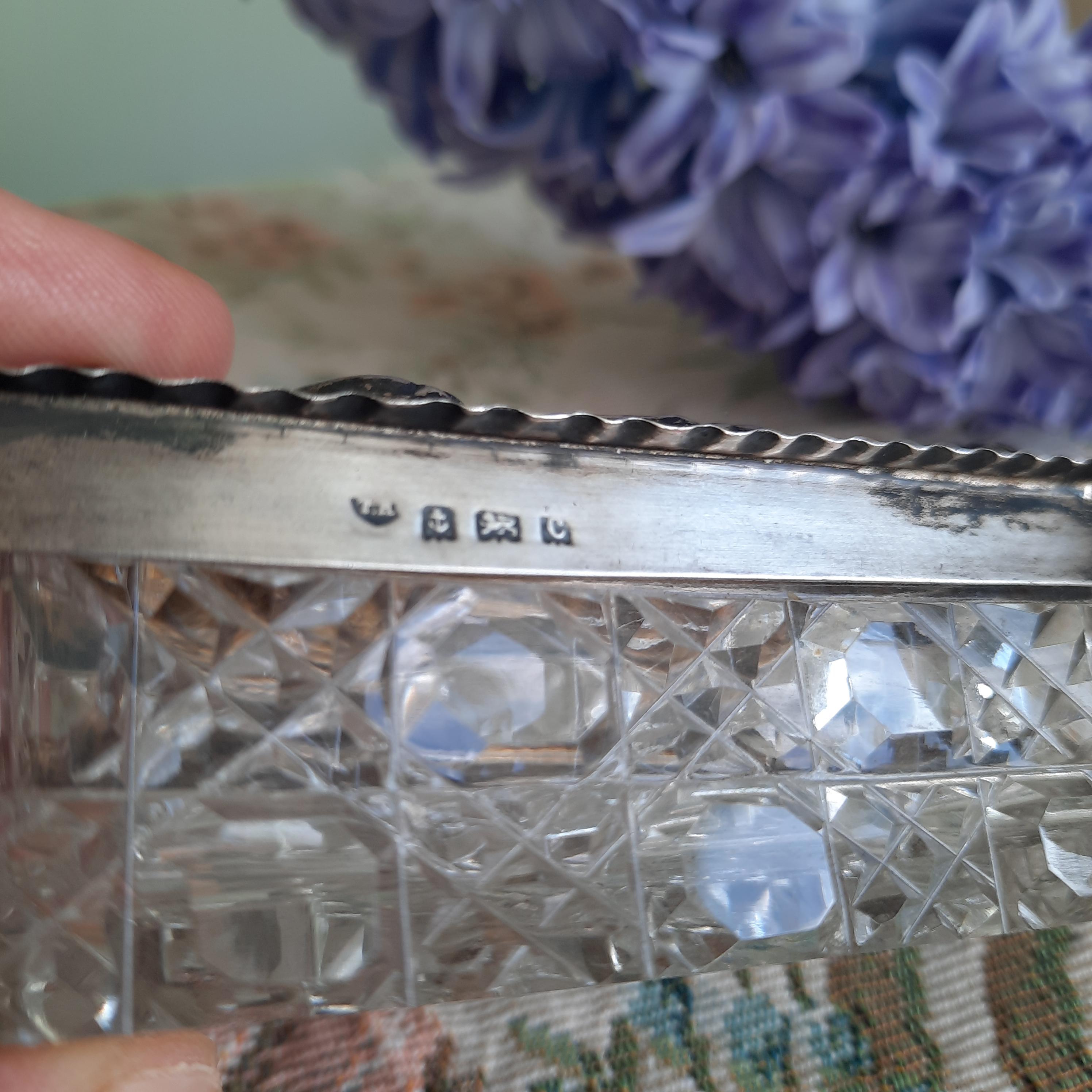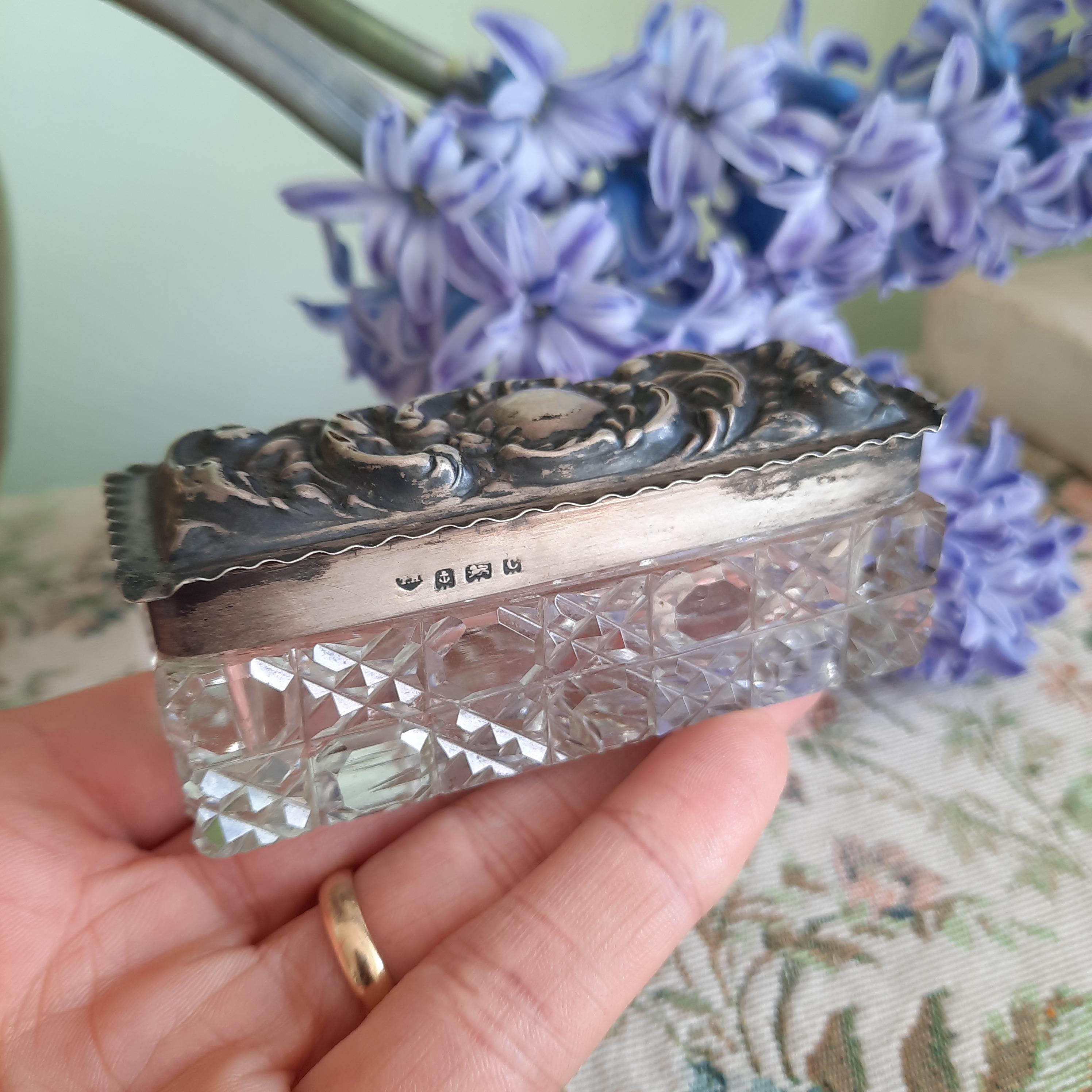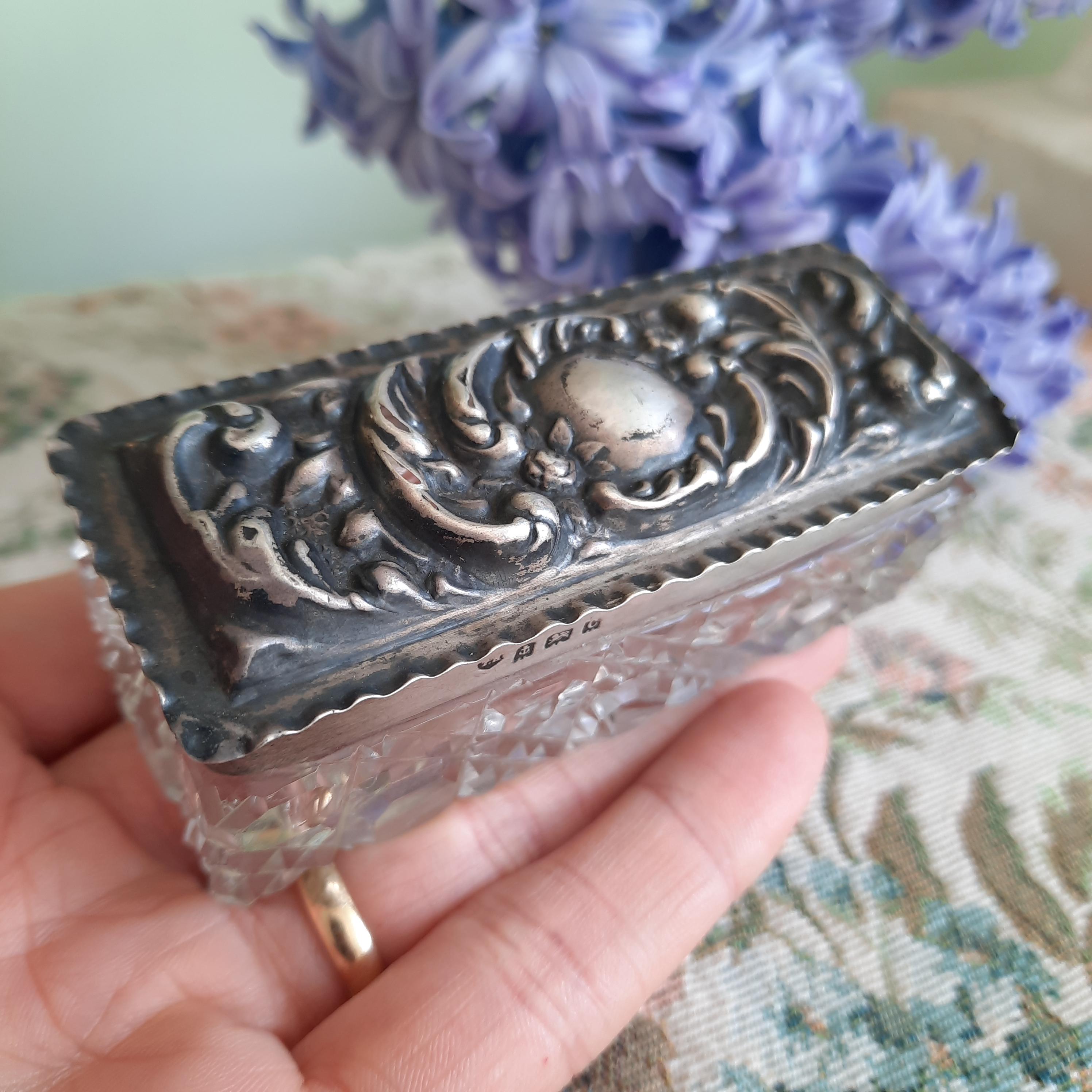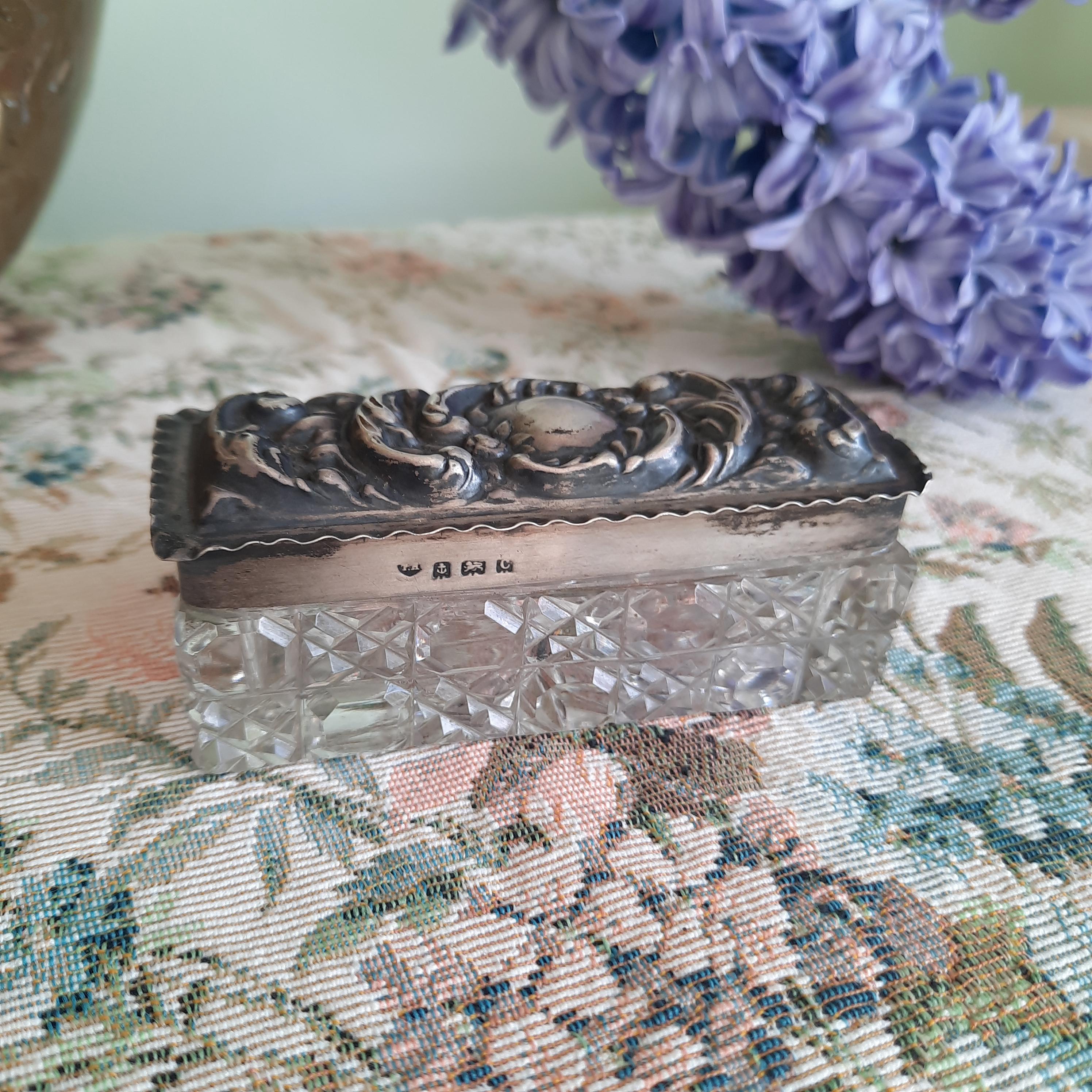 Small solid silver lidded cut glass trinket box.