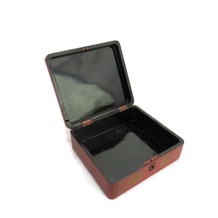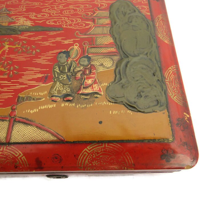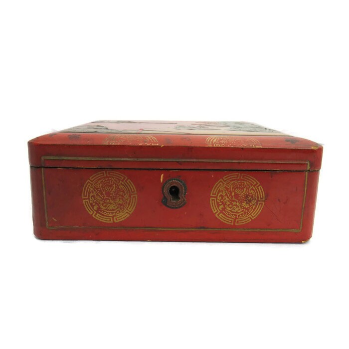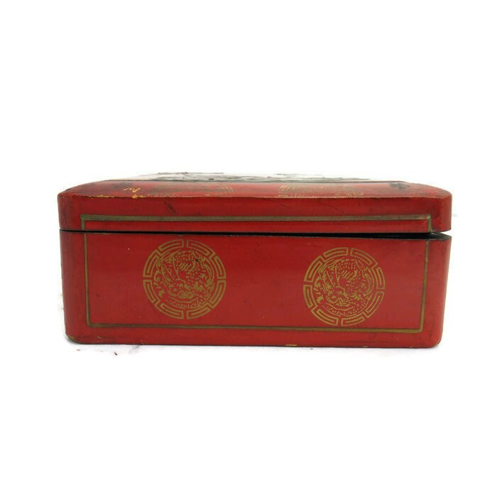 THIS BEAUTIFUL BOX IS HAND PAINTED IN RED AND GOLD .DEPICTING AN ORIENTAL SCENE ON THE TOP AND DRAGONS TO THE SIDES OF THE BOX.