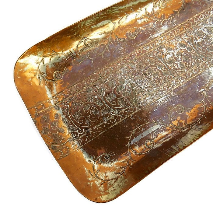 BEAUTIFULLY HAND ENGRAVED COPPER TRAY ,HAND MADE IN ISRAEL .THIS TRAY WOULD LOOK FANTASTIC IN A BOHEMIAN HOME ,OR IN AN ECLECTIC HOME AND WOULD MAKE A WONDERFUL GIFT FOR TOO.
