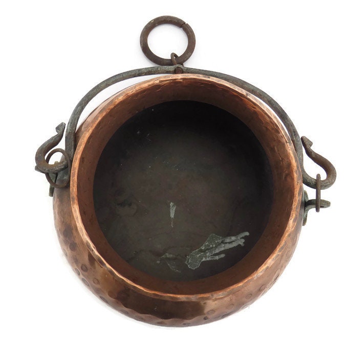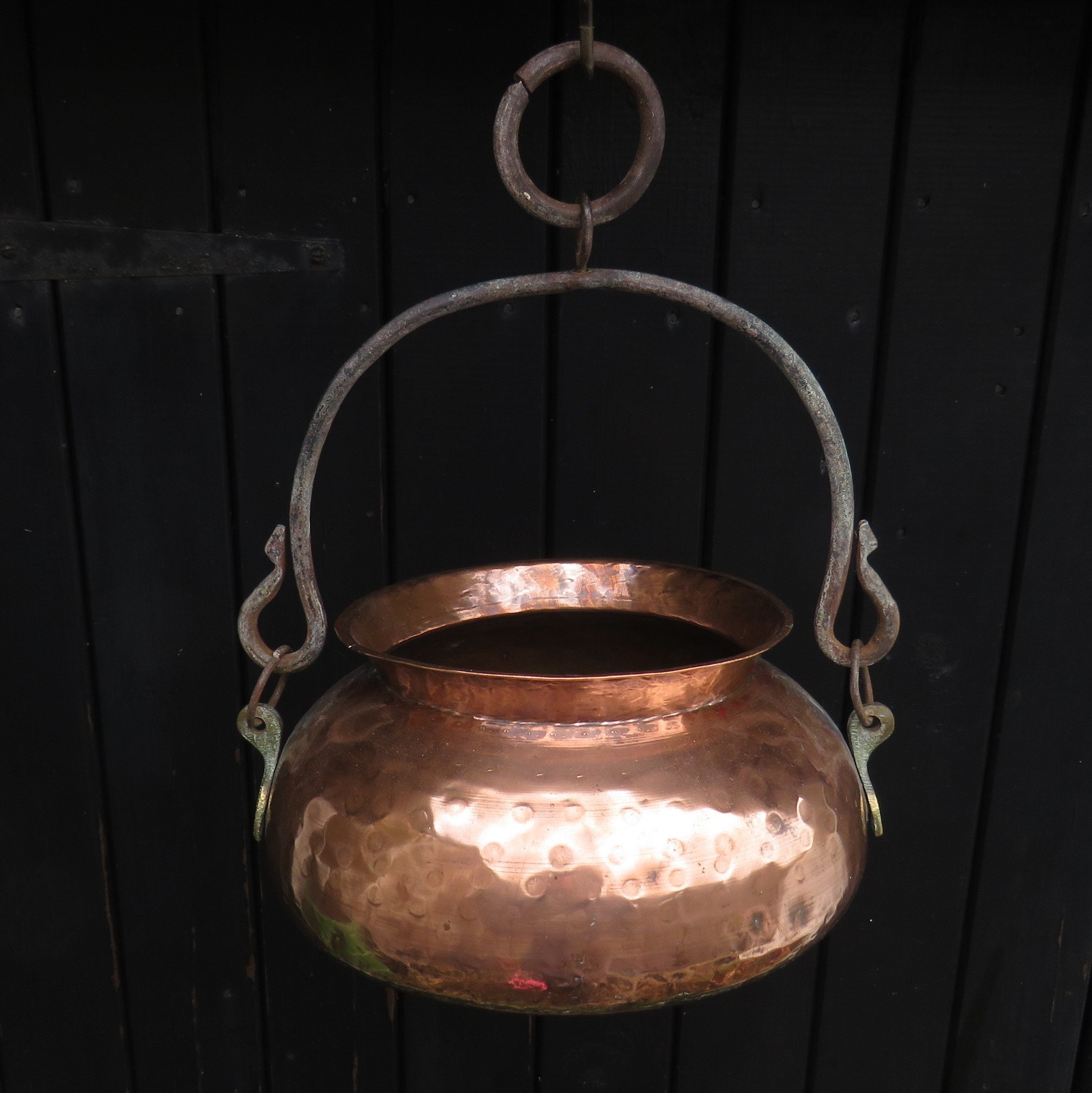 VINTAGE RUSTIC HANGING COPPER PLANT POT - CAULDRON .