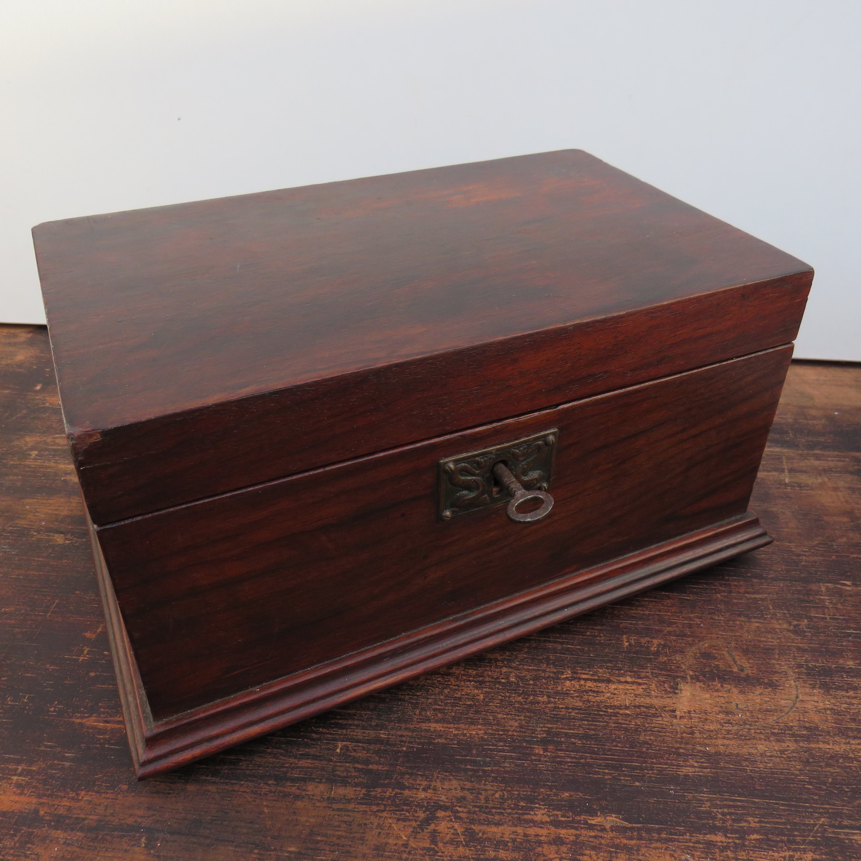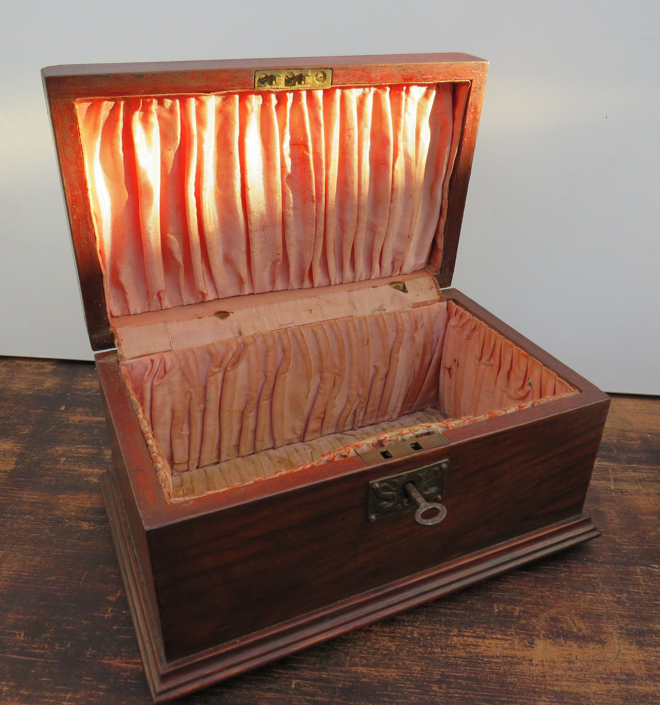 ANTIQUE VICTORIAN WOODEN TRINKET BOX WITH KEY.