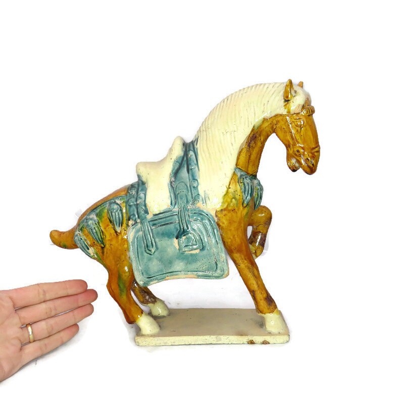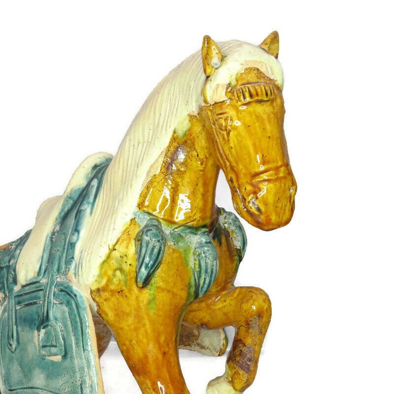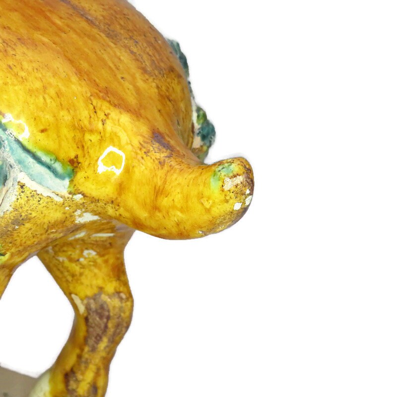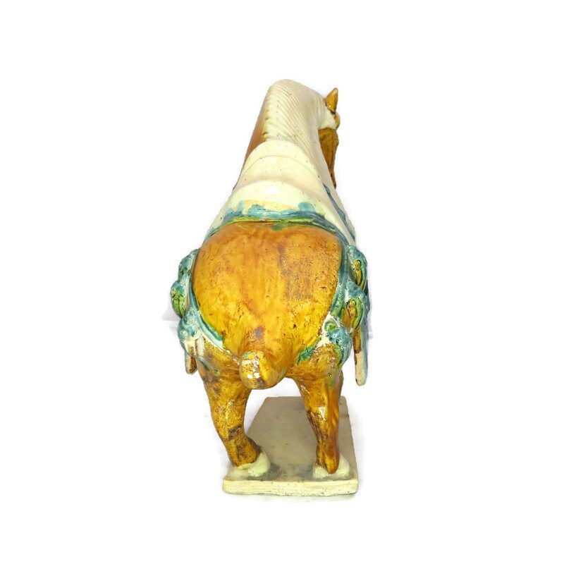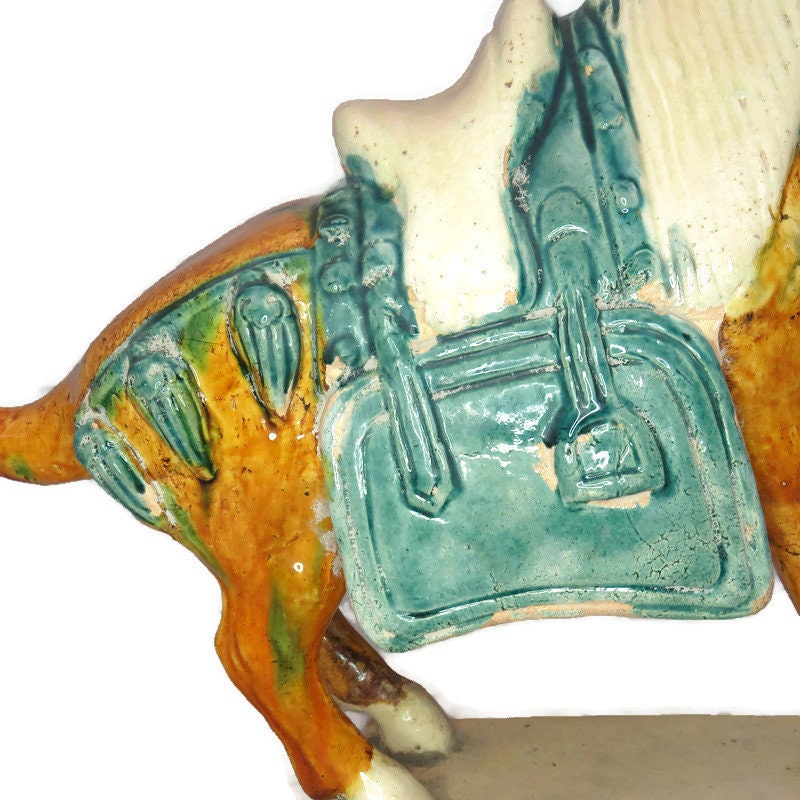 CONDITION; GOOD ,A COUPLE OF SMALL CHIPS TO THE GLAZE ,ON THE TAIL OF THE HORSE -LAST PIC-AND LIGHT WEAR.THE GLAZE IS MISSING IN SOME SPOTS AS IT IS TRADITIONAL WITH SANCAI POTTERY ,THIS IS MADE PURPOSELY .
