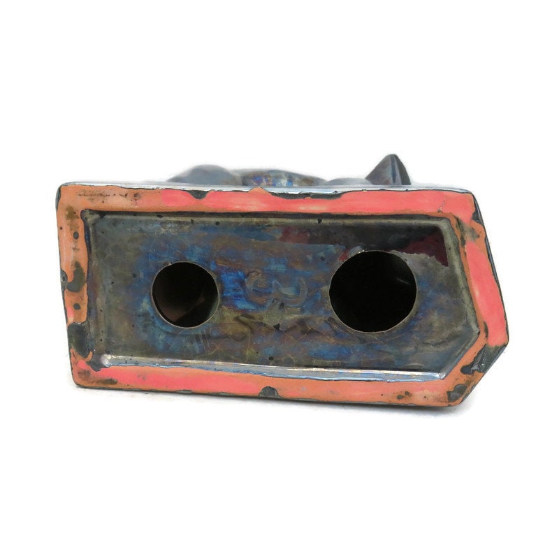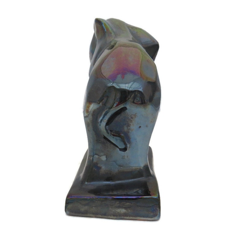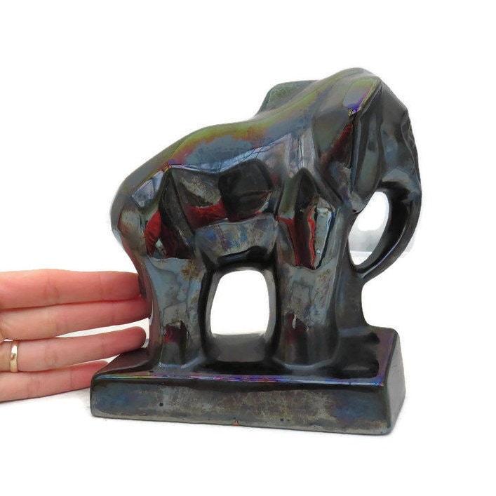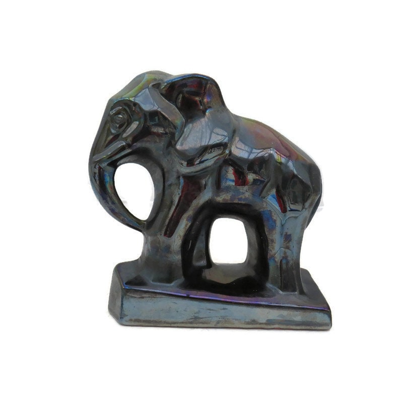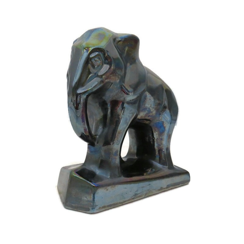 French Art Deco Cubist Ceramic Elephant Figure .Dark Green Lustre 1930's Elephant Statuette .