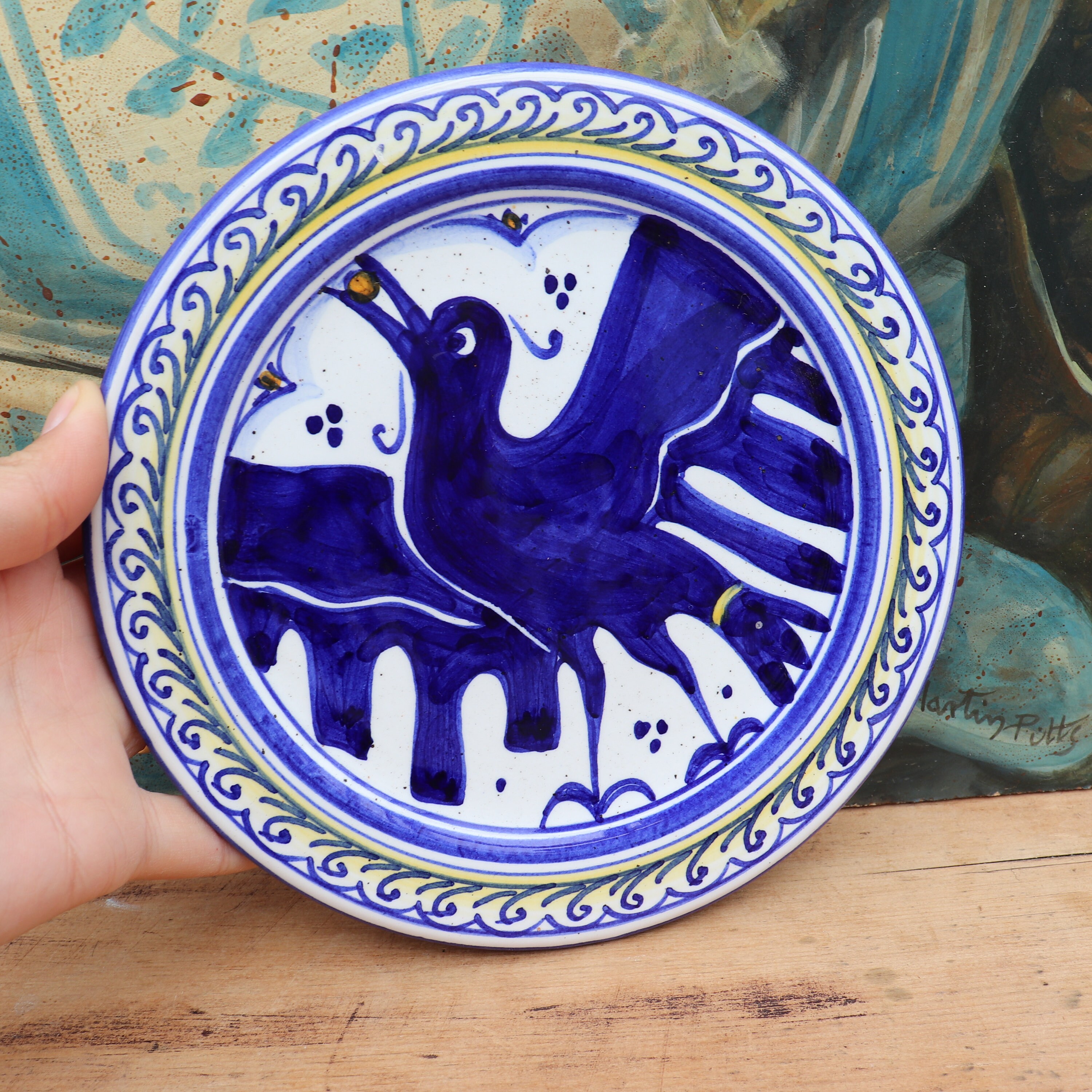 ITALIAN CERAMIC WALL PLATE WITH HAND PAINTED CRAW BY GEMI ,FAENZA .