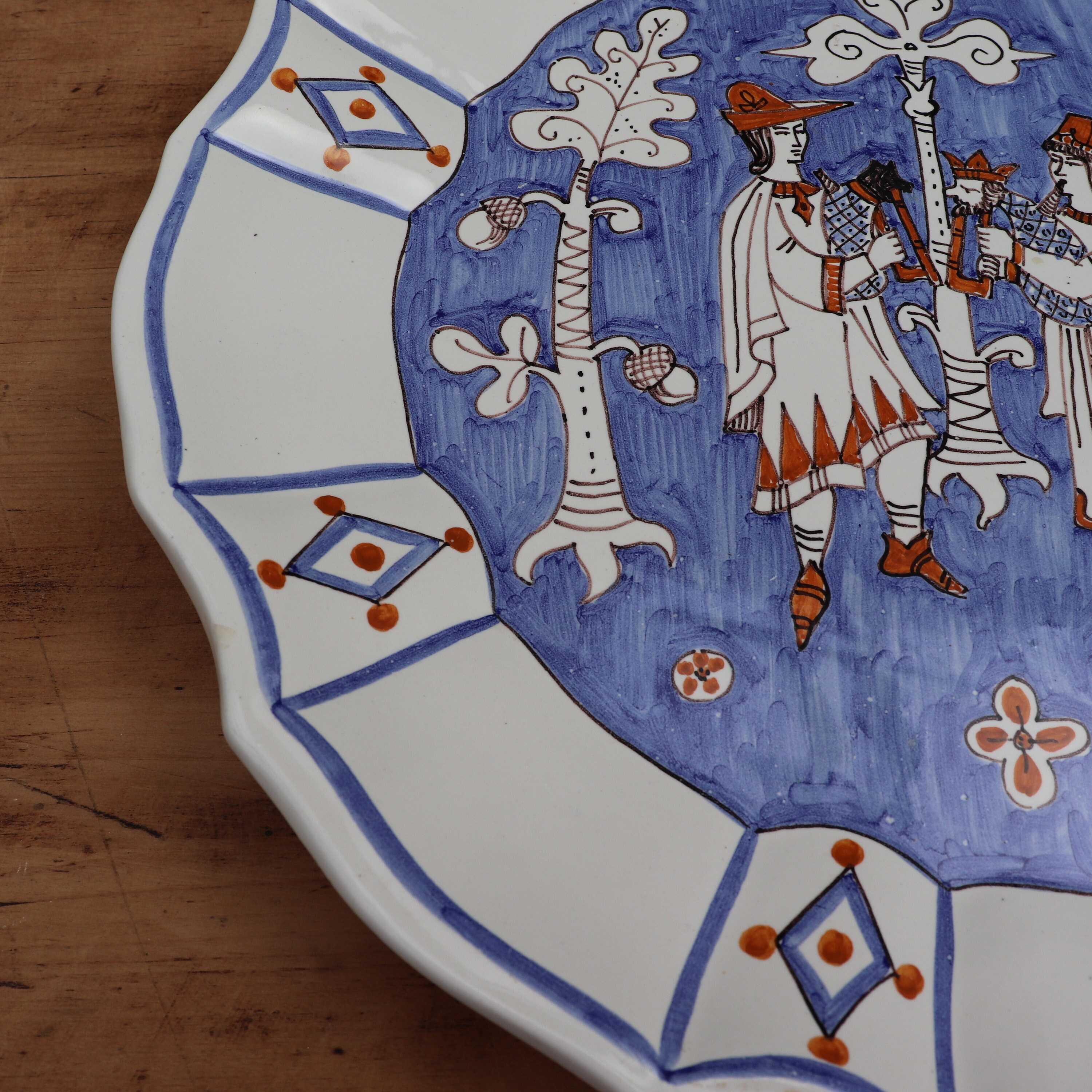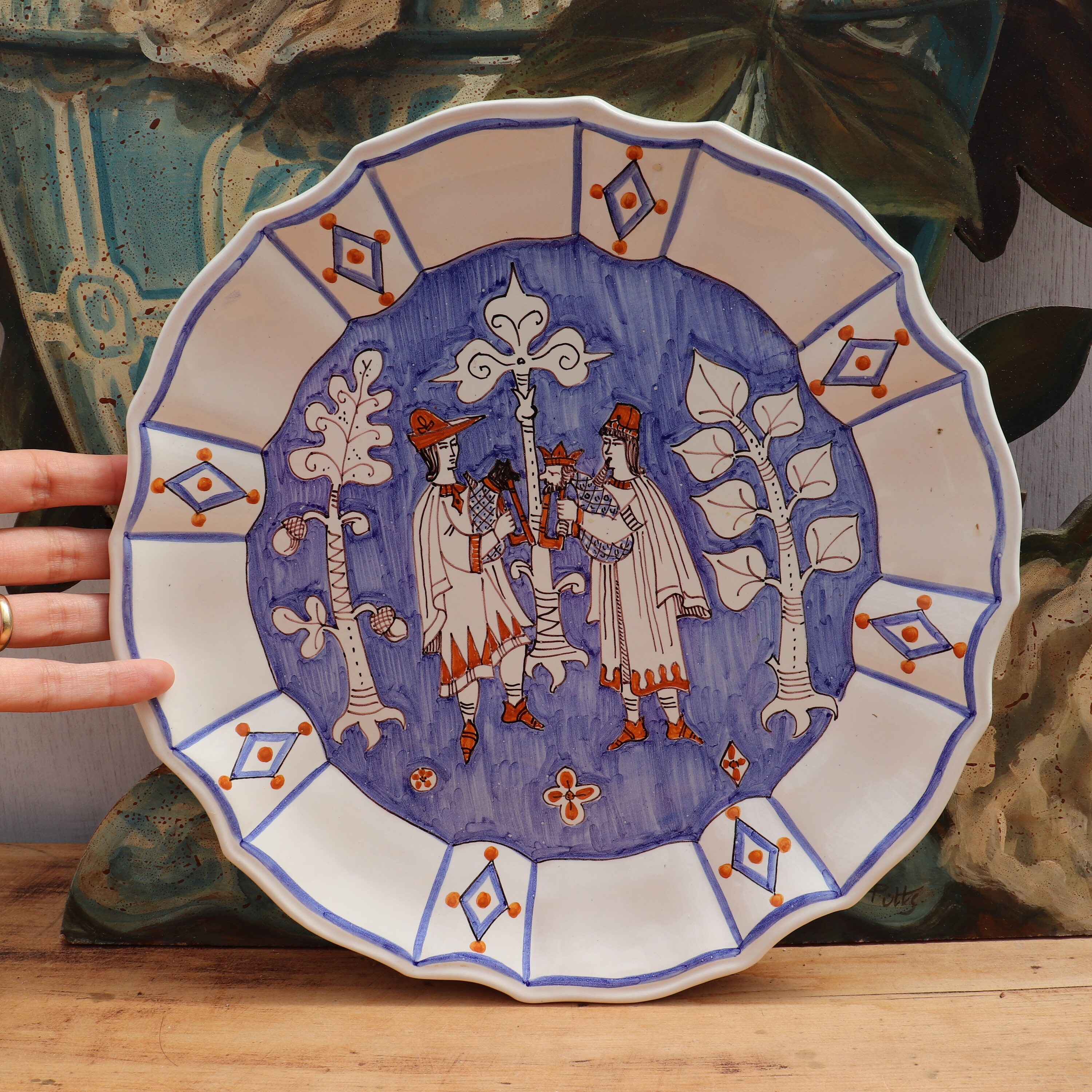 ITALIAN CERAMIC WALL PLATE WITH HAND PAINTED MEDIEVAL SCENE RAMPINI GUBBIO ,ITALY .