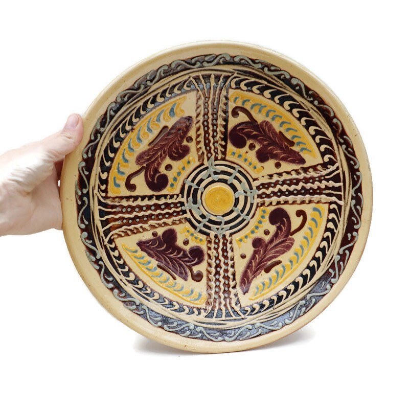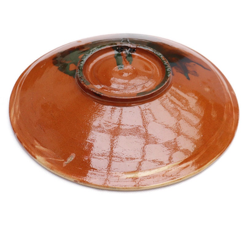 LARGE SPANISH RUSTIC HAND PAINTED AND HAND-THROWN CERAMIC WALL PLATE .