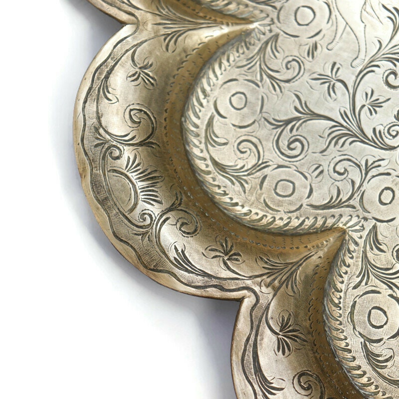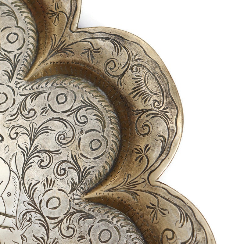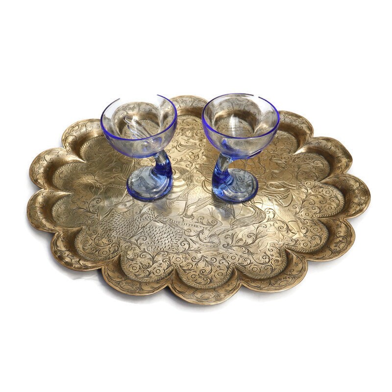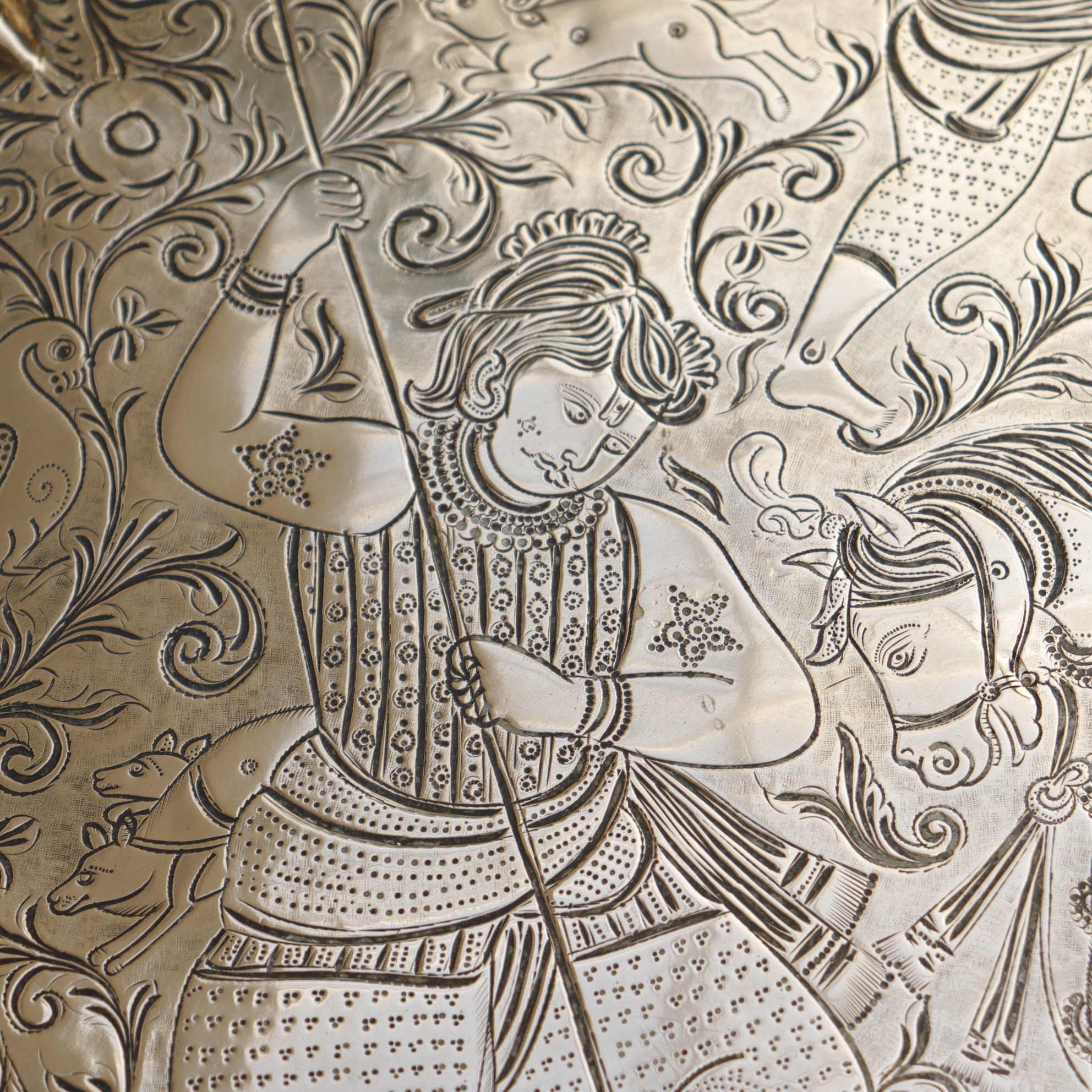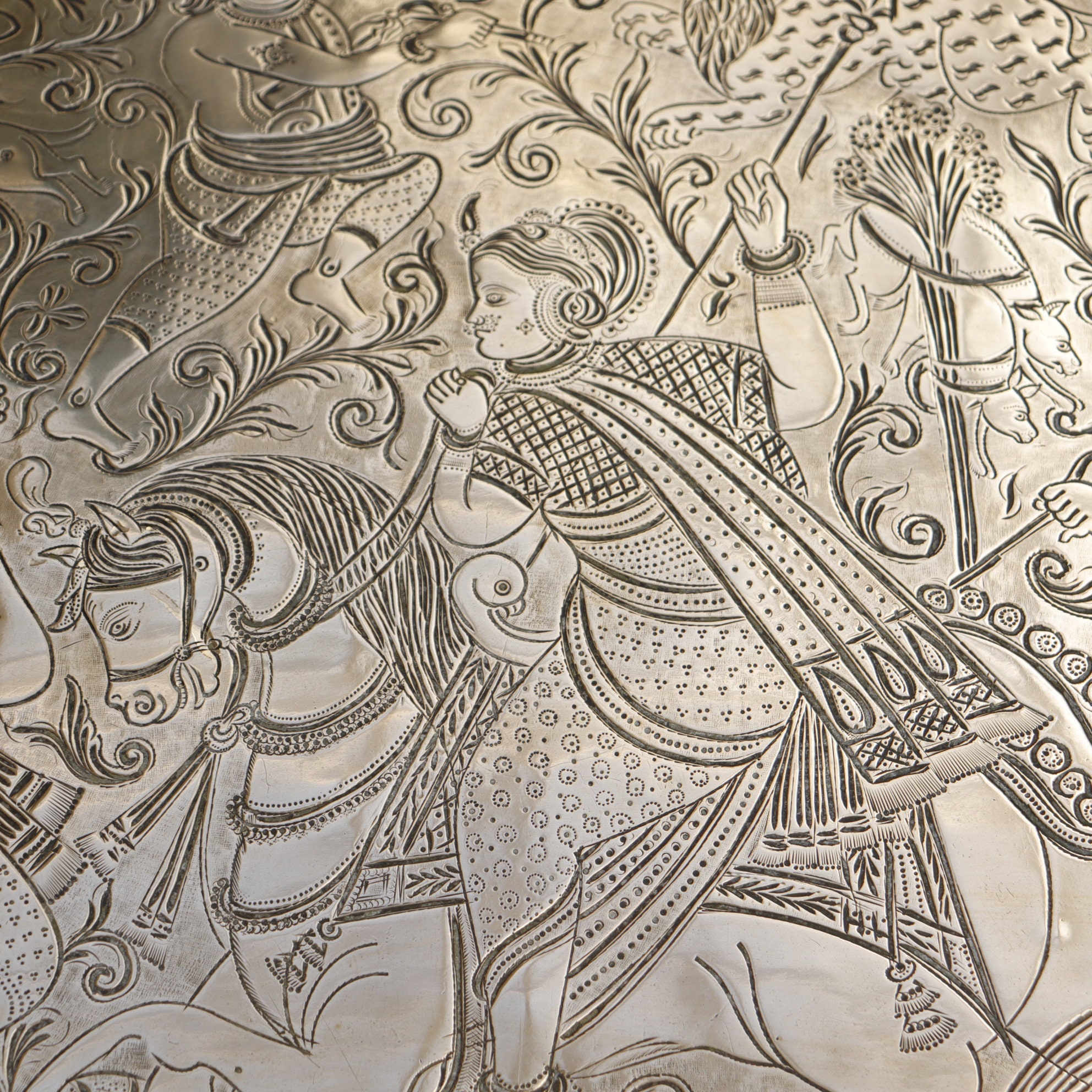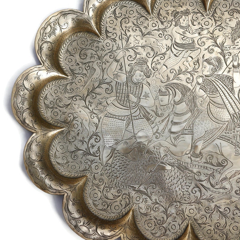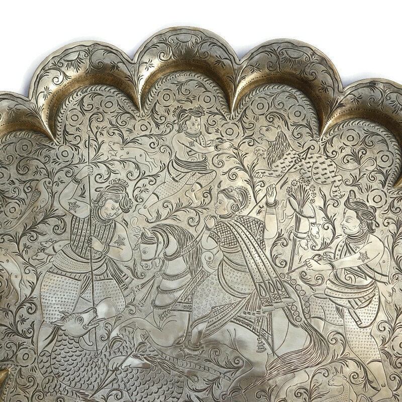 Large Antique Indian tray with hand engraved design Indra fighting Vrita .